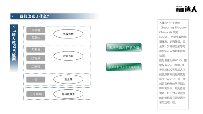 “这是以科学方式精准检测生态有机生活成效的开创性探索实验,在中国乃至全球的同类型实验中尚属首次,实验结果以严谨的科学数据,验证了生态有机饮食与生活方式,对人体内分泌有害干扰物的改善的真实和积极成效。”