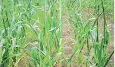 2、2,4-D-丁酯药害 主要表现为叶片扭曲,心部叶片形成葱叶状卷曲,并呈现不正常的拉长,非人工剥离雄穗不能抽出。严重时叶片变黄,干枯;玉米气生根发育畸形,根系弱小,茎明显变细,生长矮缩。