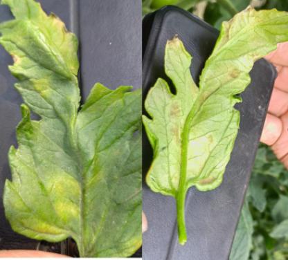 主要危害叶片并且从老叶开始向上逐渐漫延,严重时也会危害茎、花、果。叶部染病,叶正面会出现不规则淡黄色病斑,叶背面会在正面叶斑的下方形成霉层,开始是白色霉层,而后变成灰褐色直至黑褐色绒毛状。严重时全叶会发生卷曲干枯。