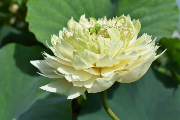 ‘莲韵含翠’是人工定向杂交选育出的荷花品种,属中小株型,始花期在6月下旬。花色出开时为绿色,盛开时为黄绿色;着花繁密,一平米缸植花量22-27朵;花蕾绿色,卵圆锥型;花型为重台型,花态碗状或叠球状;花瓣多为倒卵状披针形或倒披针形;叶片绿色,近圆形;花姿丰满,初开时碗状,盛开时叠球状;花朵姿态优美,雄蕊大部分瓣化,雌蕊多泡状,嫩绿色,不结实。