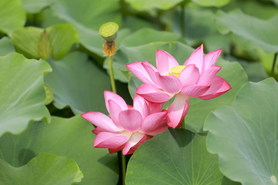 荷 花:荷花是莲科,莲属,多年生挺水型水生草本花卉。又名莲花、芙蕖、菡萏、水芙蓉等。根状茎横生,茎长而肥厚,节间膨大,有长节,内有多数纵行通气孔道,节部缢缩;叶盾圆形,表面深绿色,被蜡质白粉覆盖,背面灰绿色,全缘稍呈波状,上面光滑,具白粉,下面叶脉从中央射出,有1-2次叉状分枝;叶柄粗壮,圆柱形,中空,外面散生小刺。京津冀地区群体花期6-9月,单生于花梗顶端,花瓣多数,嵌生在花托穴内;品种不同其形态特征不同。