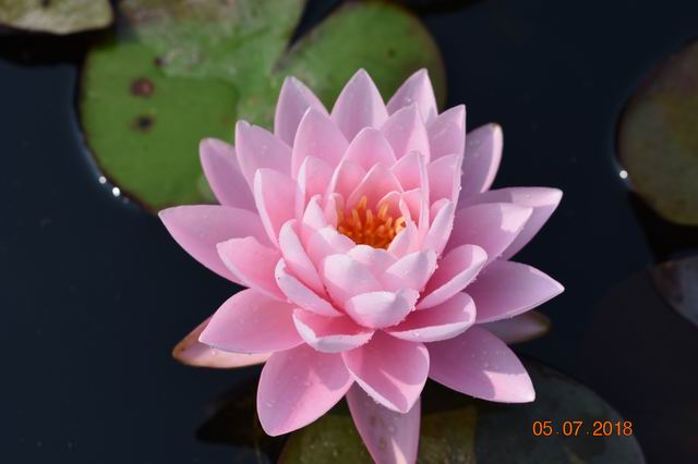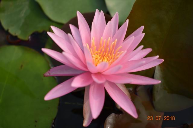 上午开放、午后闭合。大型品种,香睡莲型块茎。花粉红色,是粉红色系中的佼佼者。花态杯状,花径18~22cm。花有香气,挺出水面开放,花瓣36枚。叶圆形,上表面草绿色,下表面暗红色,幼叶暗红色。花梗和叶柄密被柔毛,表皮颜色绿色。株叶展幅1.5~1.8m。