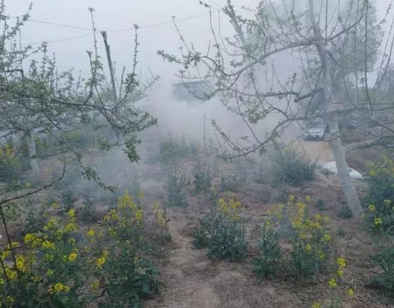 熏烟是一种提高地表温度、防止苗木霜冻的方法。一般在霜冻发生的前一天晚上开始实施。熏烟的主要材料是湿度较大的玉米秆、麦秸、锯末、枝条等,一般按照45~60堆/hm2的密度设置,即能满足需要。火堆材料的重量一般为20~25kg/堆。在熏烟过程中,要做到小火、大烟,保持有较浓的烟幕,直到日出以后为止。