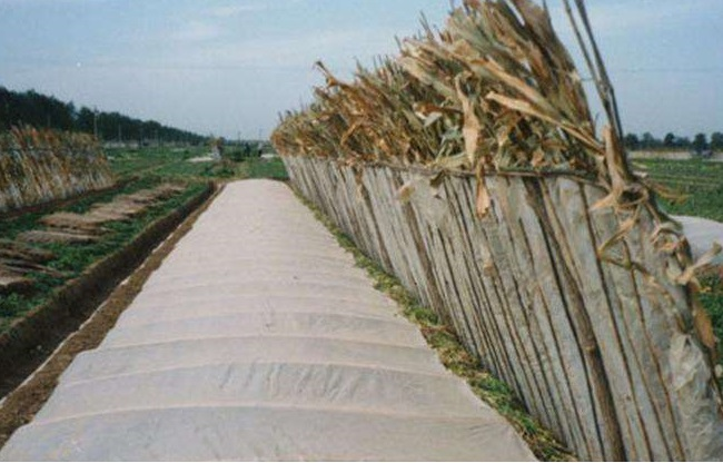 在冬春风大且干旱的北方地区,可以采用设立防寒风障的方法来防止苗木生理干旱。防寒风障一般是在土壤上冻前用玉米秆、高粱秆等捆扎而成;有条件的地区还可以架设彩条布或无纺布风障,其挡风效果更好,使用年限长,但一性投资较大。防寒风障方向应与主风方向垂直,亦可向顺风一面稍微倾斜,宽度和厚度因地而异,每道风障之间随高度增加可适当加宽。撤除防寒风障时不应一次撤完,要分3~5d撤除。采用该方法能够起到降低风速、减少苗木水分蒸腾、积雪保墒、防止春旱的作用,但是费料、费工,增加育苗成本。