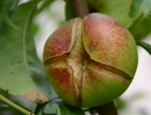 蟠桃果形为扁圆形,其果顶果皮与果核间果肉很薄,因而在果实膨大期灌水、幼果期干旱至果皮老化后遇雨,或果顶向上果皮温湿度日变化大等因素,都容易引起裂果。