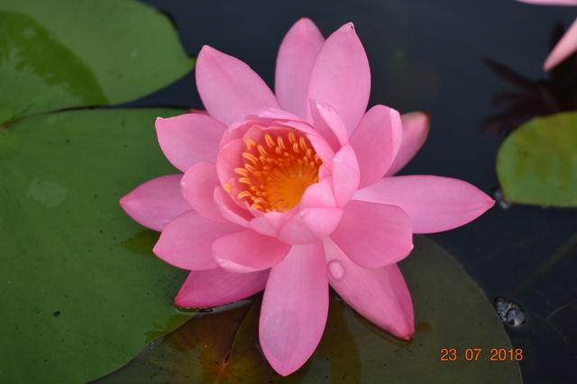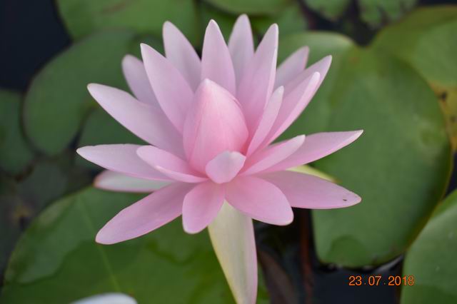 上午开放,午后闭合,香睡莲型块茎。花色粉红色,花先杯状后放射状。花径15-18cm,花瓣数25-30。叶面草绿色,叶背带微红。花梗和叶柄表皮暗紫红色,被有短柔毛。适合中小池塘栽植。