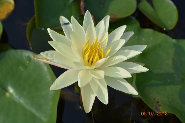 晨开午合,花挺水开放,着花繁密。花深黄色,花瓣较长,端部锐尖。花星状,直径10~13cm。花梗绿色,具大量绒毛。叶表绿色,斑纹不明显,新叶叶表斑纹明显;叶背斑纹明显。叶片近圆形,叶基浅裂。叶柄绿色,具大量绒毛。深黄的花色极为艳丽,适合中及大型池塘栽植应用。
