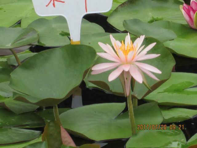 晨开午合,花挺水开放,香睡莲型根茎,着花量适中,中株型。花淡紫粉色,星形,直径14~15cm,微香,花瓣数29。花梗绿色,具大量绒毛。叶表绿色,新叶深紫色;叶背深紫色。叶圆形,叶基通常“V”字形开裂。叶柄绿色,具大量绒毛。