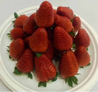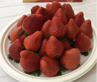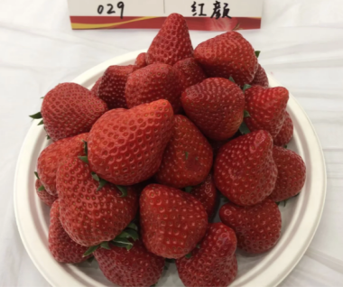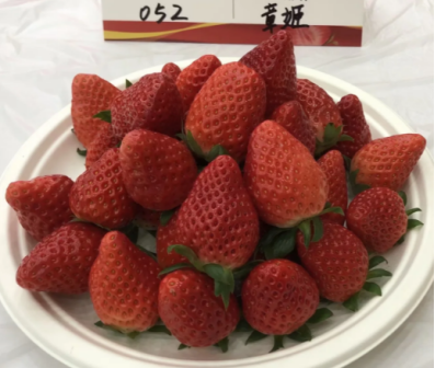 河北省农林科学院石家庄果树研究所选育,亲本为‘甜查理’ב红颜’,2023年6月通过河北省种子总站非主要农作物品种认定。果实长圆锥形,果皮鲜红色,着色均匀。果肉红色,口感细腻。果个大,一级序果平均单果重70 g,最大可达180 g,二级序果36.9 g。含可溶性固形物9.0 %~13.6 %,果实酸甜可口,香气浓,品质佳。
