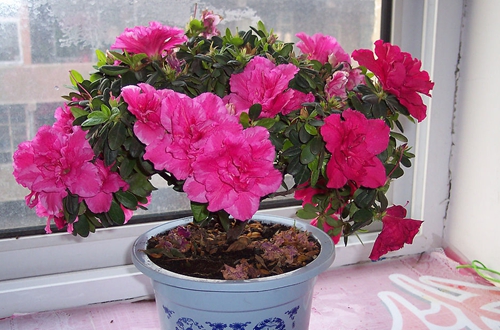 4、盆栽杜鹃花放置地点有讲究,一般应放在东南方向阳台,而且要通风,尽量少移动。不通风则易患黑斑病,大批落叶。