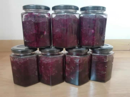 3.7装罐密封:玫瑰鲜花酱颜色鲜亮。因此,最好使用玻璃容器盛装,以展现其品相。为防止玻璃容器受热不均破裂,应先进行蒸煮消毒,并使其在灌装时保持在80℃以上。将混合好的酱体趁热倒入,留5毫米左右顶隙并密封。装罐时要尽快装入,装罐完毕后罐体温度应在80℃左右。