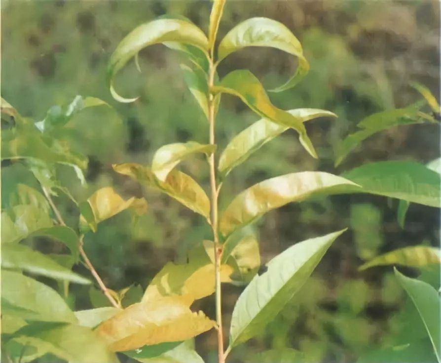 桃树缺铁症又称黄叶病、白叶病、褪绿病等,在盐碱土或钙质土的果区更为常见。缺铁症主要表现在新梢的幼嫩叶片上,开始叶肉先变黄,而叶脉两侧仍保持绿色,致使叶面呈绿色网纹状失绿。随病势发展,叶片失绿程度加重,出现整叶变为白色,叶缘枯焦,引起落叶。严重缺铁时,新梢顶端枯死。由于铁元素在植物体内难以转移,所以缺铁症状多从新梢顶端的幼嫩叶开始表现。