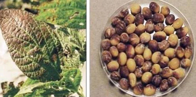 紫斑病:病粒种皮上有淡紫色至深紫色的斑点。斑点大小不一,严重时整个豆粒变成紫色。另一种病粒症状是形成“黑霉豆”。病粒斑呈褐色或黑褐色,有时略带黑色,籽粒干缩,种皮处有纵行裂纹。