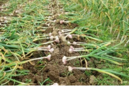 4.蒜头膨大期:蒜苔收获后,蒜头进入膨大盛期,要及时浇透水,结合浇水亩追施尿素 20 公斤,磷酸二铵7公斤,硫酸钾 15 公斤,或三元复合肥 20-25公斤,此时要保持地面见干见湿,根据天气情况6-7天浇一次水,收获蒜头前 3-4天停止浇水,促进茎、叶部的同化物加速向蒜头转运,使蒜头膨大达到最大化,提高产量和质量。