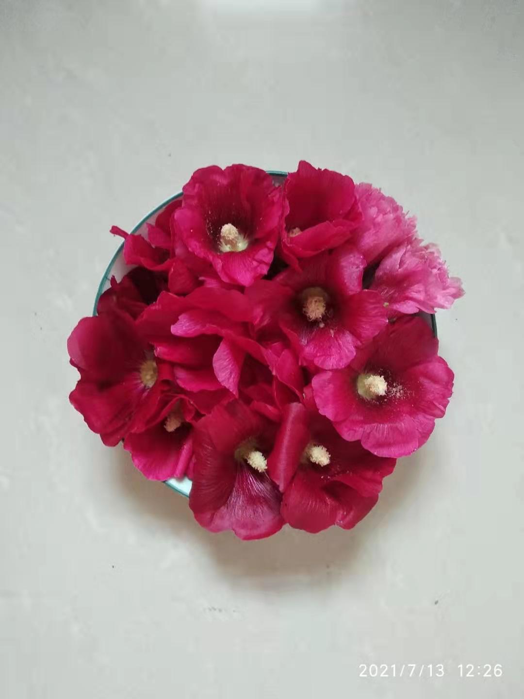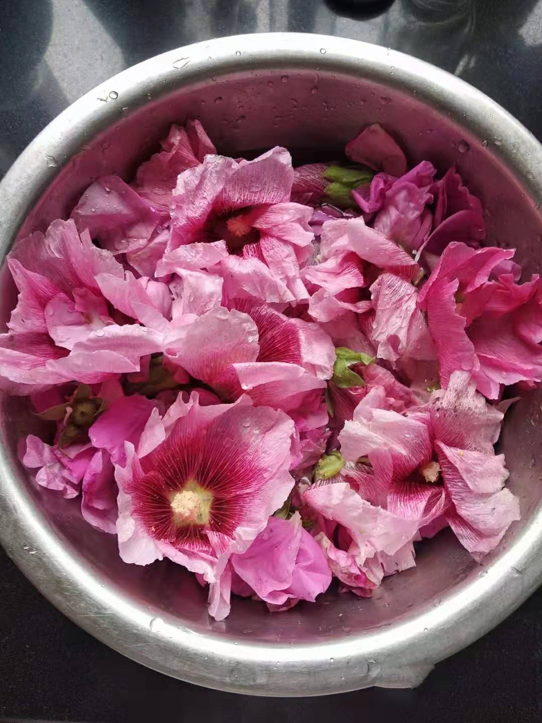 2. 蜀葵花炒鸡蛋:蜀葵花去掉绿色花蒂后,洗净,切碎和鸡蛋一起搅匀炒食。