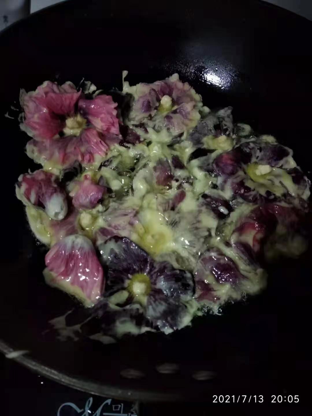 1. 炸蜀葵花:去掉绿色花蒂后,洗净,鸡蛋和面调成糊状,加少许盐和味精,蜀葵花两面粘面糊,放油锅里翻炸即可。