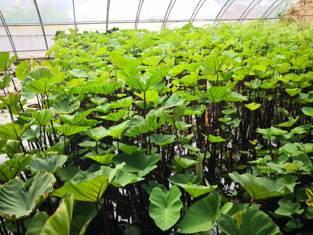 多年生湿生草本植物。块茎粗厚;侧生小球茎若干枚,倒卵形,表面生褐色须根,可食。叶片有块茎顶部抽出,高1-1.2m;叶柄圆柱形,紫褐色;叶盾状,卵状箭形,深绿色。佛焰苞绿色或紫色,向上缢缩,变白色;肉穗花序。花果期7-9月。 是园林水景中,大型观叶植物。在北方需保护性越冬。