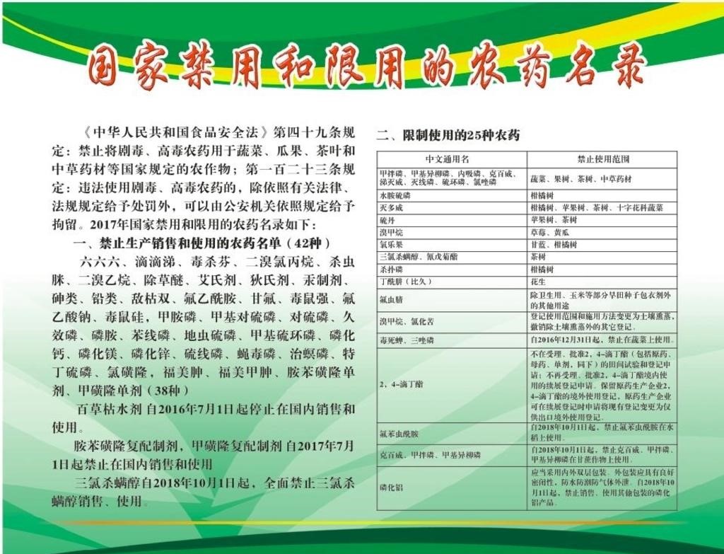 禁止氧乐果在甘蓝上使用;禁止三氯杀螨醇和氰戊菊酯在茶树上使用;禁止丁酰肼(比久)在花生上使用;禁止特丁硫磷在甘蔗上使用;禁止甲拌磷,甲基异柳磷,特丁硫磷,甲基硫环磷,治螟磷,内吸磷,克百威,涕灭威,灭线磷,硫环磷,蝇毒磷,地虫硫磷,氯唑磷,苯线磷在蔬菜、果树、茶叶、中草药材上使用。