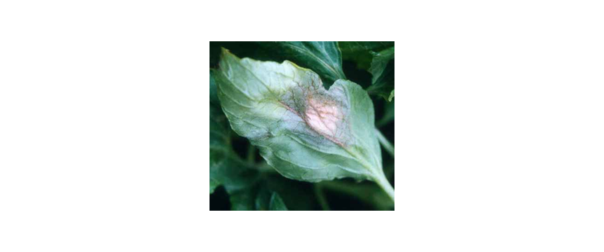 叶片受害严重时,叶表面出现水浸状淡绿色病斑,逐渐变为褐色,空气湿度大时,病斑上生有白色霉层;叶背面病斑边缘产生稀疏的白色霉层。茎和叶柄感染时,病斑呈水浸状褐色斑,并有凹陷,最后变为黑褐色,逐渐腐烂,从而引起植株萎蔫。果实上感染病菌时,病斑有时有不规则型云状纹,最初为暗绿色油渍状,后变为暗褐色至棕褐色,病健交界处边缘明显。果实质地坚硬,不变软,味有点苦。在潮湿的条件下,果面病部腐烂,并着生黑色霉层。该病发病快,危害严重时造成减产甚至绝产。