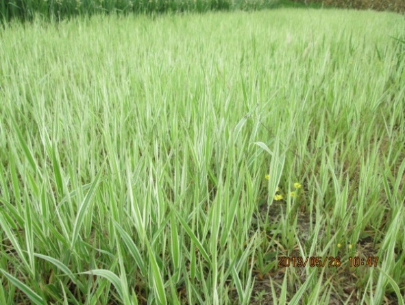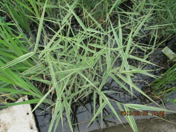 多年生挺水草本植物。地下根状茎横走,叶片带状披针形,绿白相间,茎秆直立无分支。大型圆锥花序顶生。花果期7-11月。主要用在园林水景区做绿化布置材料。
