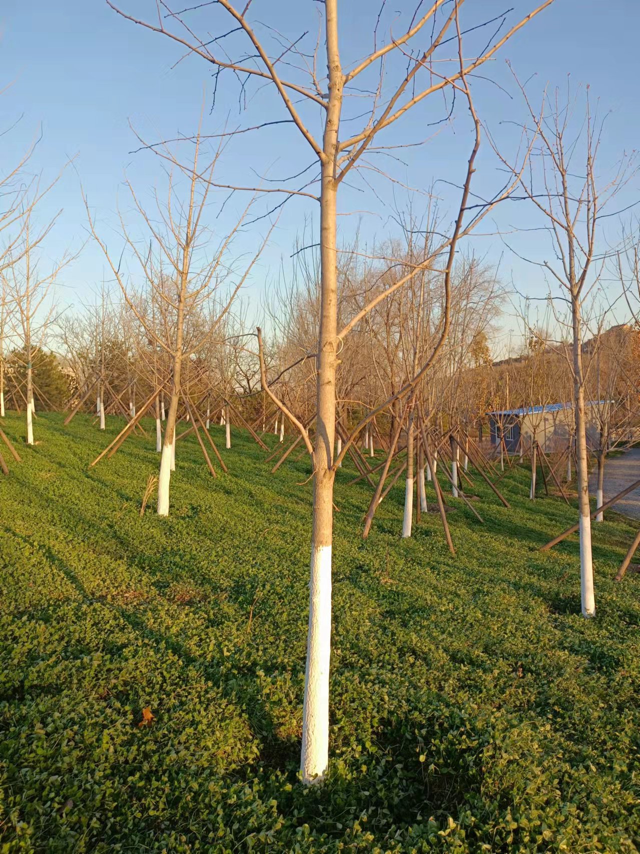 一般在秋末冬初进行,用石灰水加盐或石硫合剂对树干涂白,可以白色反射阳光,减少树干对太阳辐射热的吸收,从而降低树干的昼夜温差,防止树皮受冻。可以同时使用防虫胶带,起到预防害虫的效果。防寒措施尽量整齐统一,注意美观。