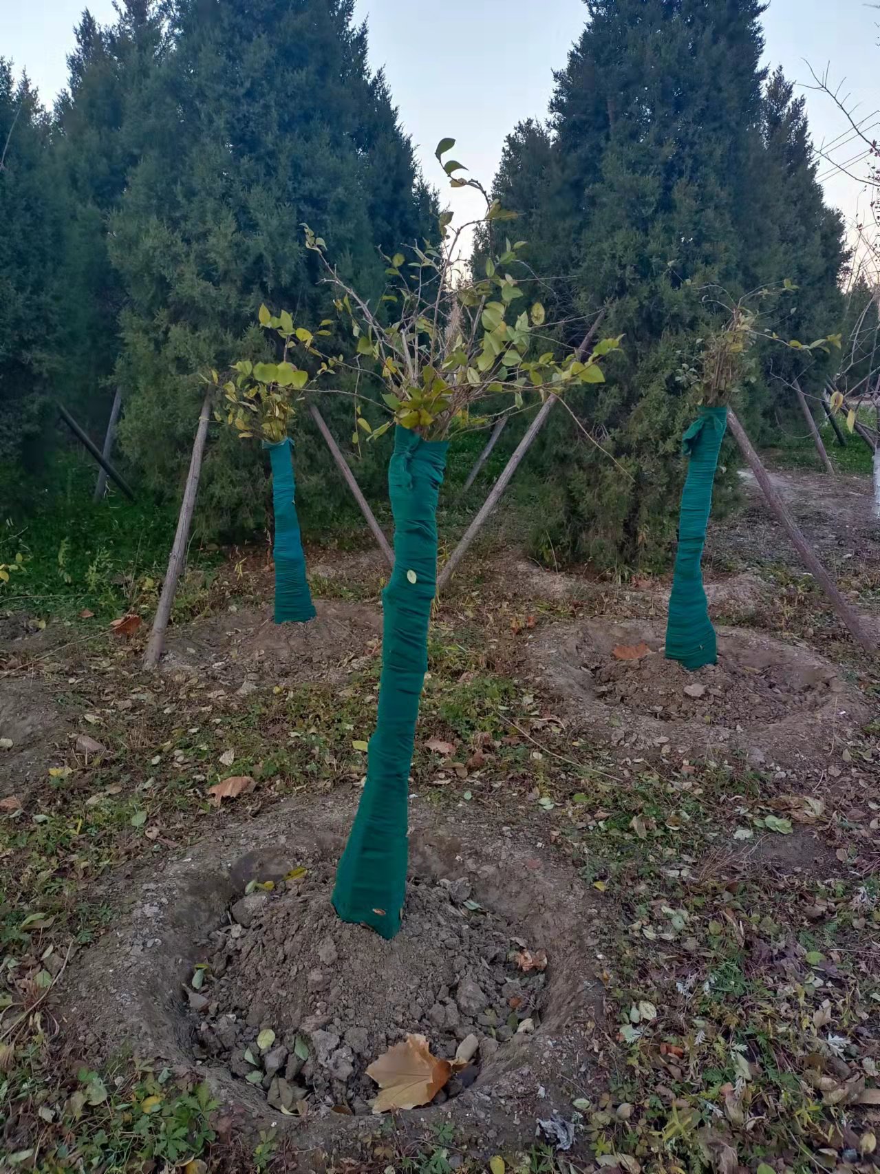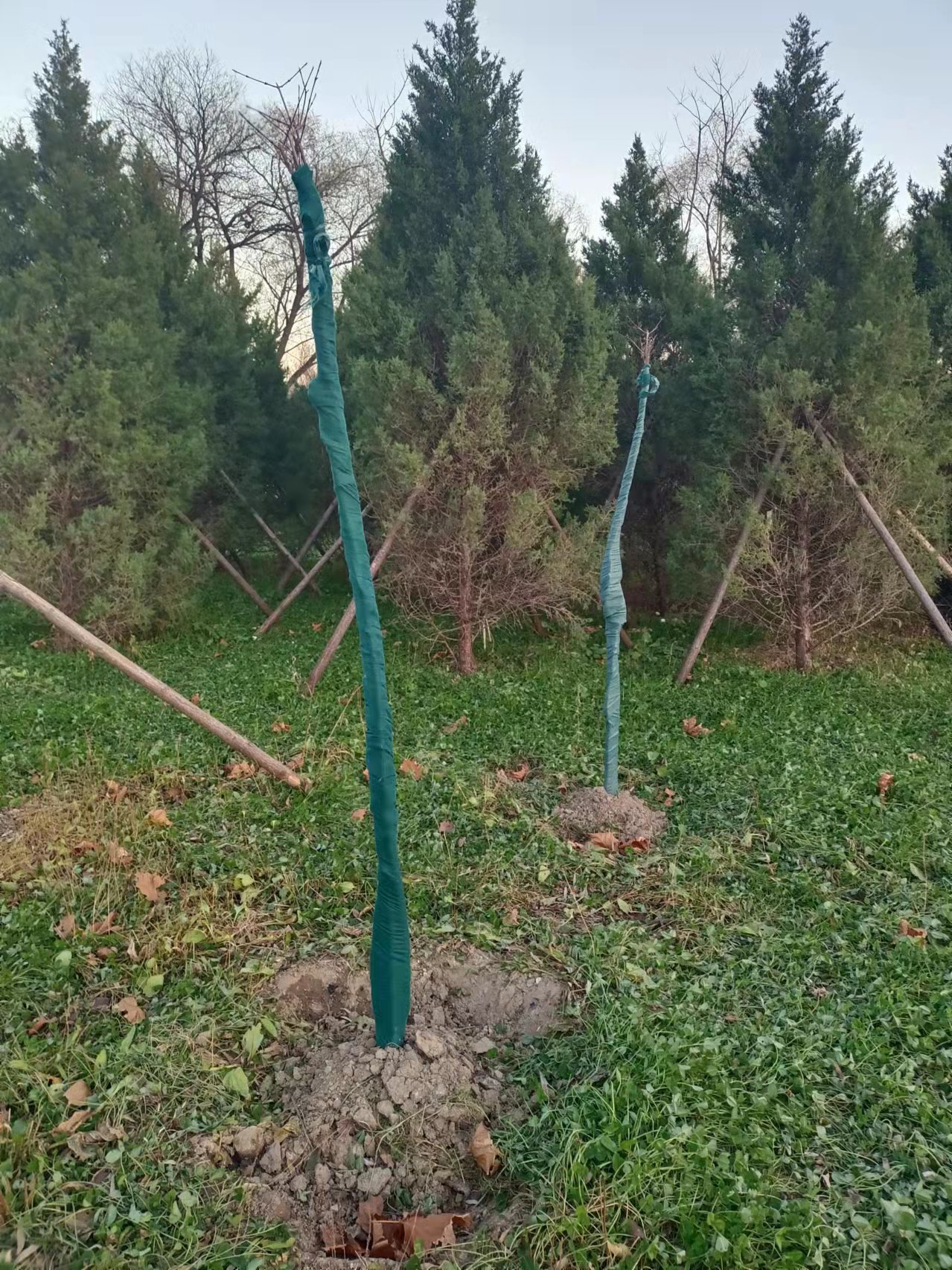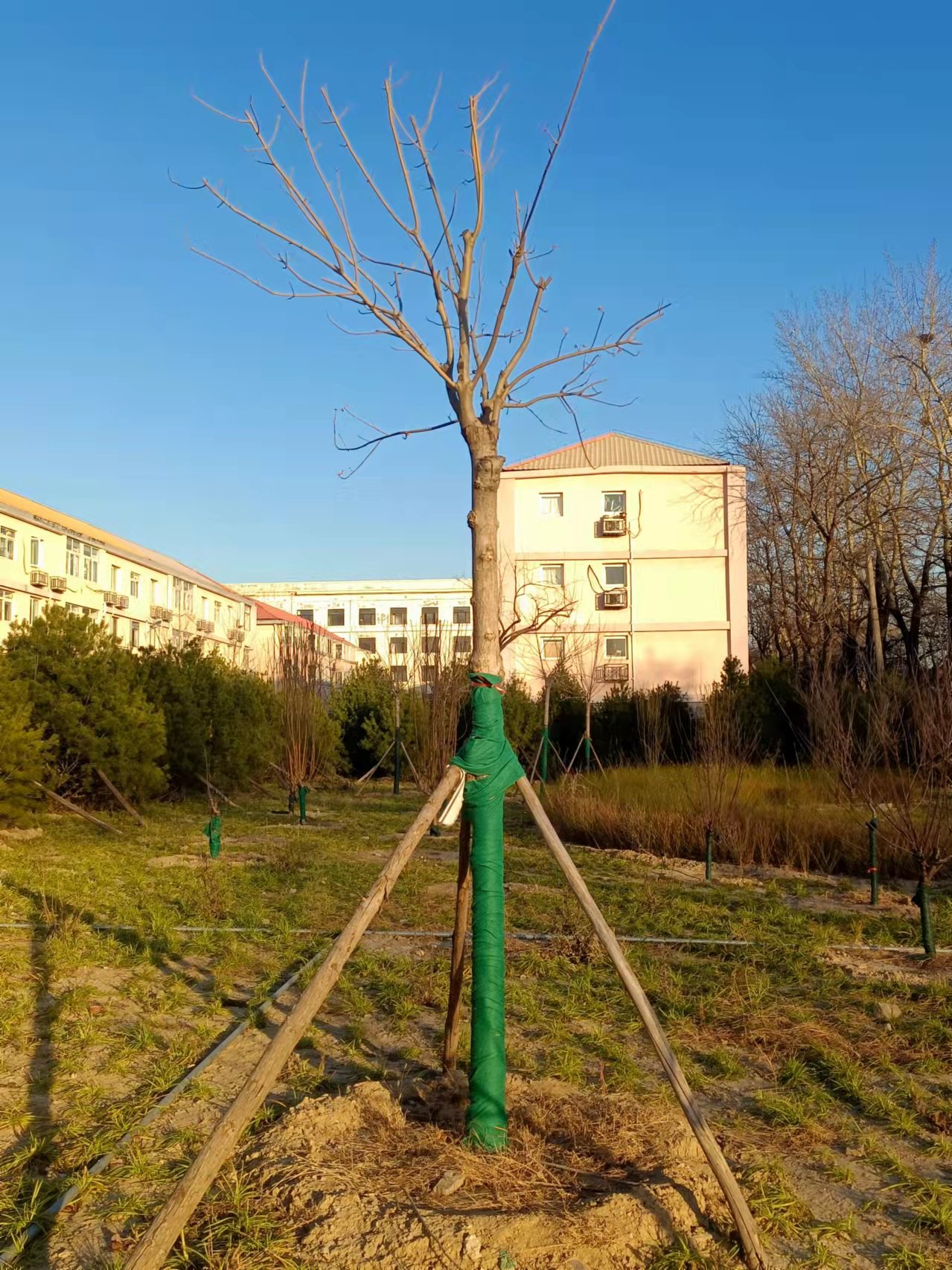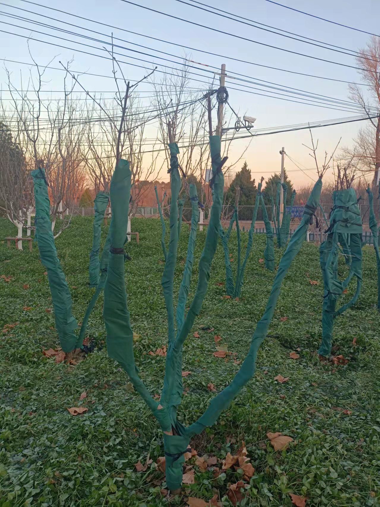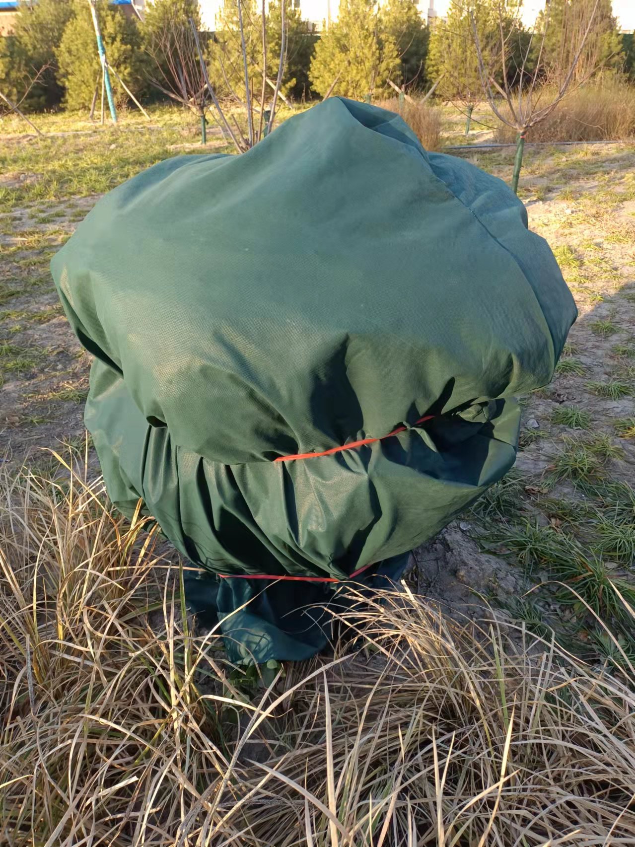 入冬前进行,将新植树木或不耐寒品种的主干用草绳或无纺布等缠绕或包裹起来,高度可在1.5-2m左右。要经常对防寒设施检查维护,发现破损及时修补,防止冻害。