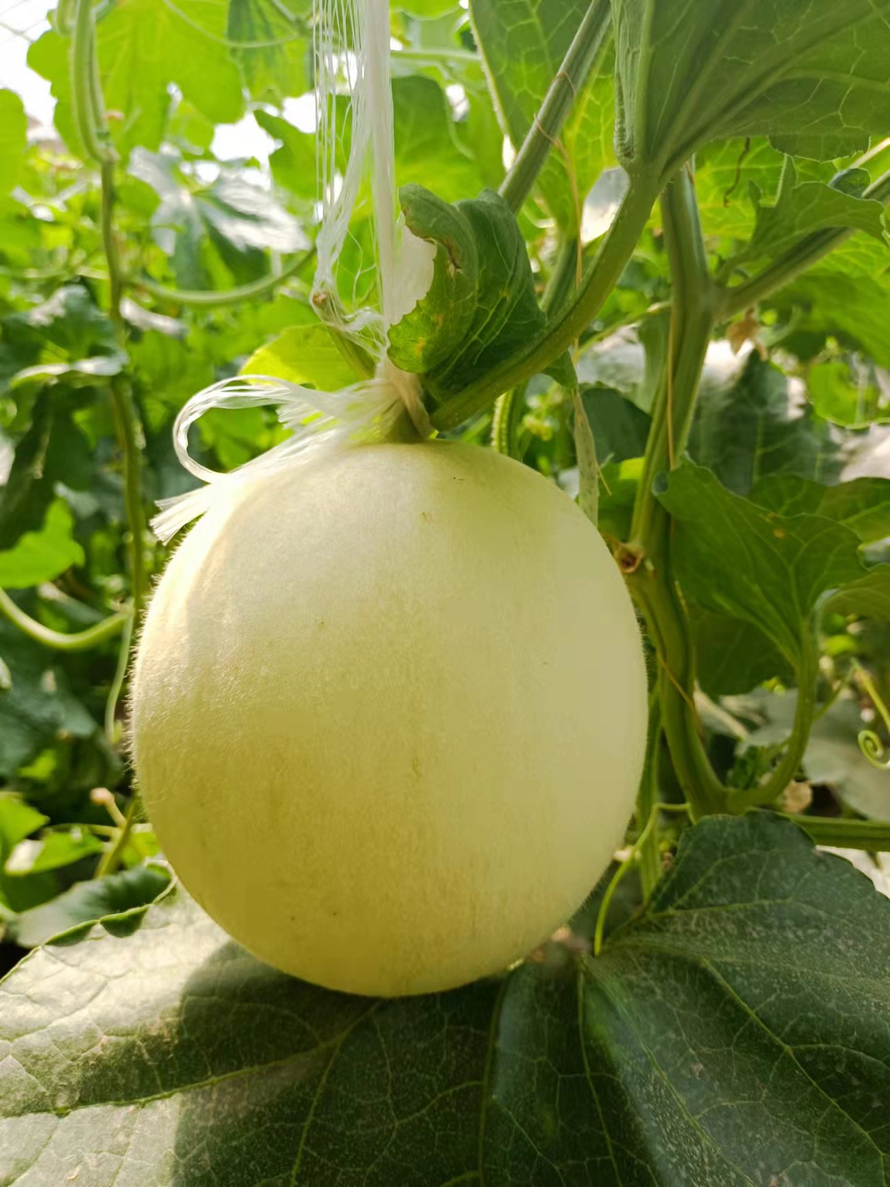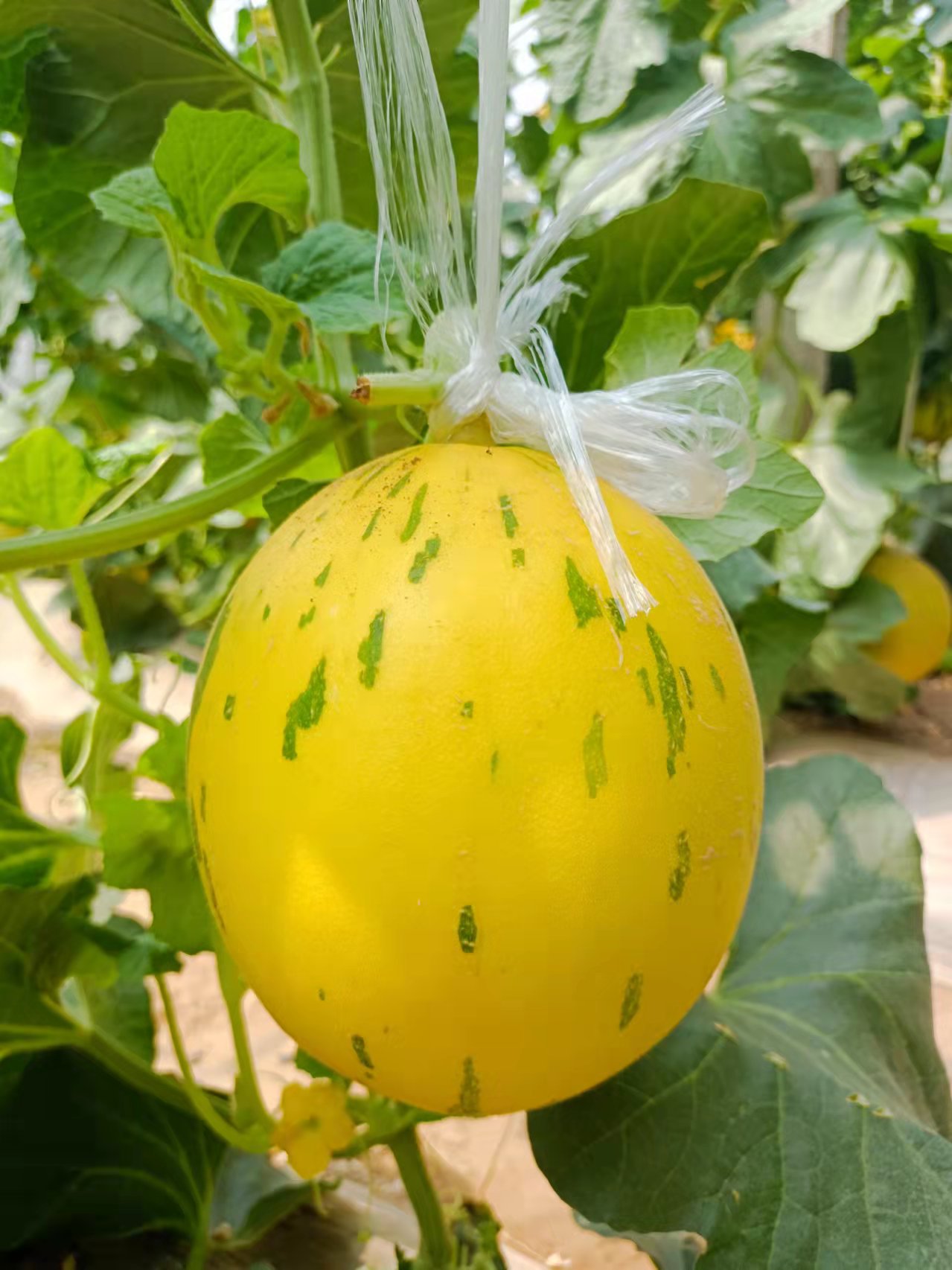 甜瓜是典型的异花授粉的虫煤花,自花授粉可结实。当气温达到20 ℃以上时花开放,花开后2 h内授粉结实率最高,采集当天雄花进行均匀涂抹柱头,促进坐瓜。当果实长到乒乓球大时,每株选定1 -2个发育好的果实,二茬瓜选留2个果实,多余果实及时摘除。