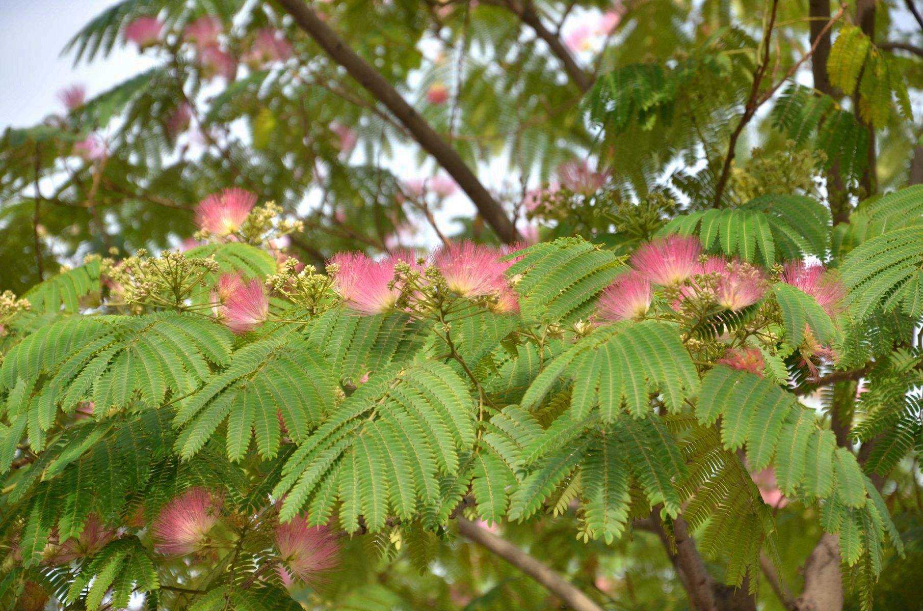 合欢树冠开阔,入夏绿荫清幽,羽状复叶昼开夜合,十分清奇,夏日粉红色绒花吐艳,十分美丽,适用于池畔、水滨、河岸和溪旁等处散植。对氯化氢、二氧化氮抗性强,对二氧化硫有一定抗性,适于厂矿、街道绿化