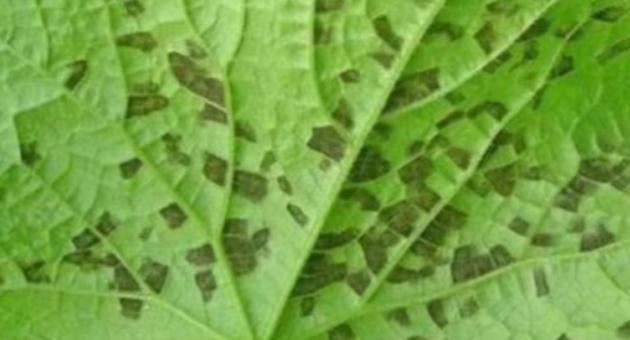 叶片呈现水浸斑,扩大后受叶脉限制。病斑多角淡褐色,颜色暗淡、无光,病斑后期黄褐色较大,后期病斑汇成片,栽培环境湿度大时,叶背黑霉。病害严重时,整片叶子完全干枯。