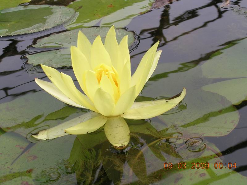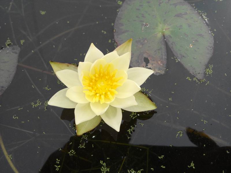 花午后开放,晚上闭合,浮水。单朵花期3~4天,群体花期5月下旬至9月下旬。花杯状而后星形,中黄色,淡香。叶卵形,叶表绿色,具深色条纹及深紫色斑块;叶背红色,带深紫斑点。手指型根茎。适宜水深15~23㎝。