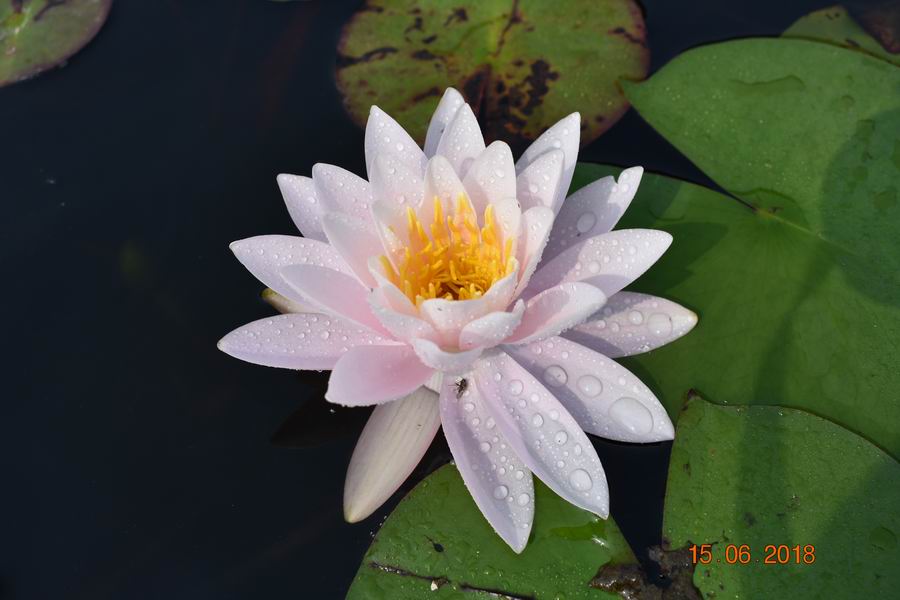 花上午开放,午后闭合,浮水。单朵花期3~4天,群体花期5月中下旬至9月中旬。花杯状,粉白色,浓香。叶圆形或长圆形,革质全缘,叶表绿色,叶背紫红色。地下茎横走,少分支。适宜水深45~90㎝。