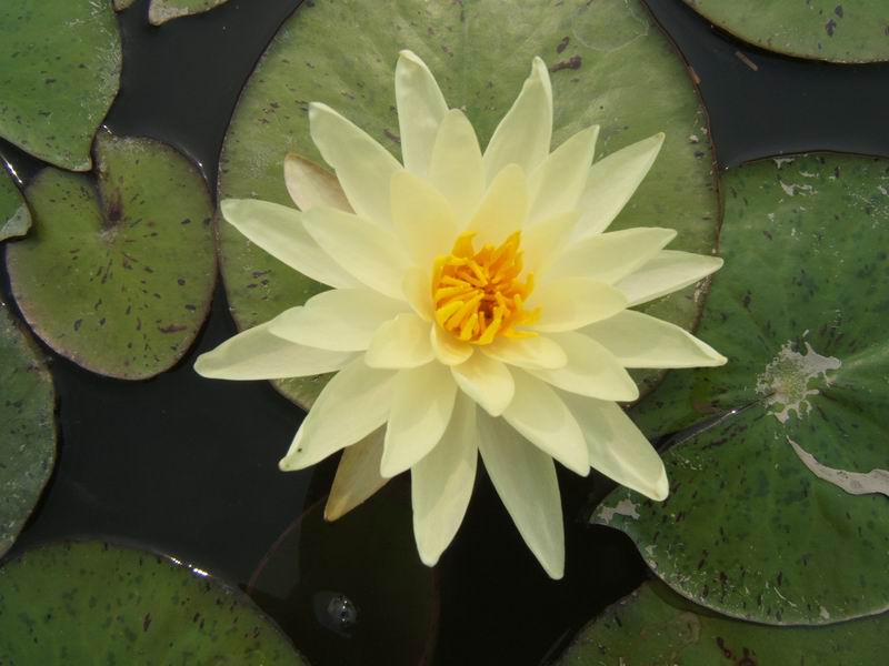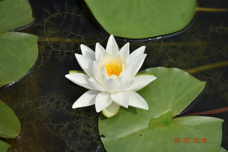 上午开放,下午闭合,浮水开放。单朵花期3~4天,群体花期5月下旬至9月下旬。花杯状至星形,白色,开花当天淡香。叶圆形,叶表绿色;叶背淡黄绿色。马利列克型根茎。适宜水深45~90㎝。
