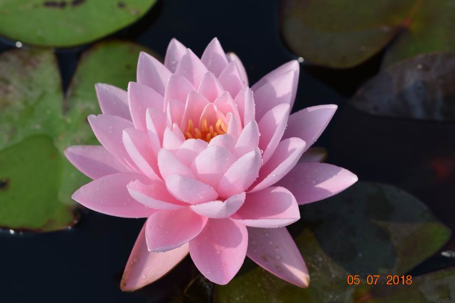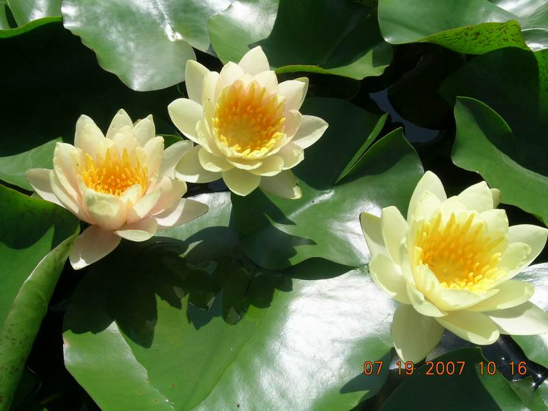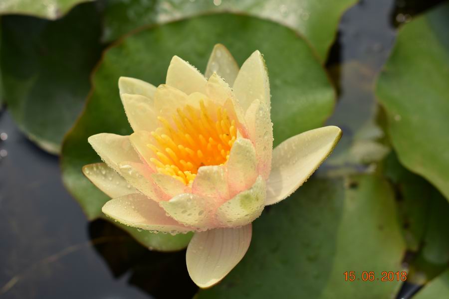 花上午开放,下午闭合,浮水。单朵花期3天,群体花期5月下旬至9月下旬。花杯状,淡橙黄色,淡香。幼叶面有密集的红褐色斑点。成叶正面斑点变淡,但是背面还较明显。马利列克型块茎。适宜水深30~45㎝。