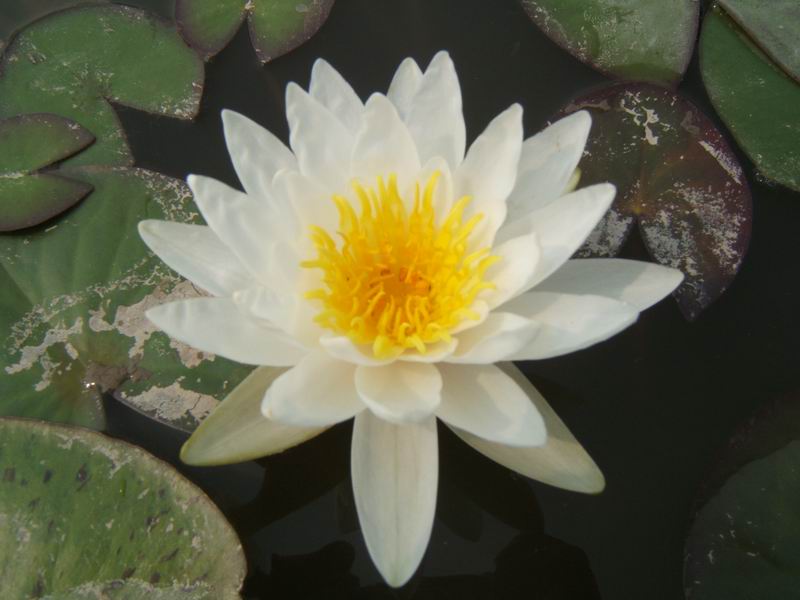 花上午开放,下午闭合,浮水。单朵花期3~4天,群体花期5月中下旬至9月下旬。花杯状,白色,基部稍带红晕,略有香气。叶正面绿色,反面淡褐色。马利列克型块茎。适宜35~75㎝的水深。