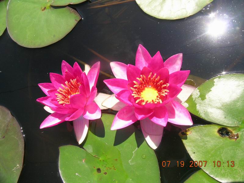 花上午开放,下午闭合,浮于水面。单朵花期4~5天,群体花期6月上旬至9月下旬。花先杯状后星形,深玫瑰红色。叶马蹄形,幼叶暗红色,有少量深红色斑点;成叶绿色。适宜水深45~90㎝。