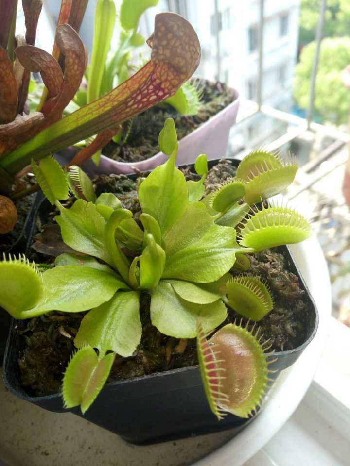 4.基质:无添加肥料的泥炭,颗粒状质料(珍珠岩、沙砾等)为1:1或纯水苔,基质必须每年春天更换一次,要注意的是捕蝇草比较喜欢酸一点儿的土质。盆栽时,盆底需垫碎瓦片。