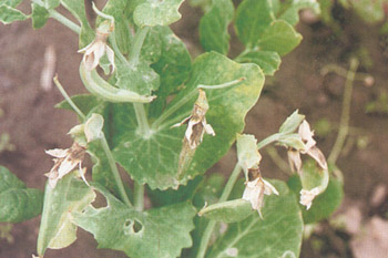 病原 Choanephora cucurbitarum(Berkeley et Rav.)Thaxter和Choanephora mandshurica(Saito et Na8amoto)Tai称瓜笄霉和茄笄霉,均属接合菌亚门真菌。C.cucurbitarum孢囊梗直立在寄主上,无色透明,无隔膜,不分枝,顶端膨大成大头针状孢囊,孢囊上又生许多小分枝,小分枝末端膨大成大孢子囊和小孢子囊。大孢子囊直径40一50flm,小孢子囊生在球状孢囊上,小孢子囊大小13—14×11—12(μm),小孢子囊含2—5个孢子,多为3个,大小10一13×5—8(μm),多为单胞,柠檬形至梭形,褐色或棕