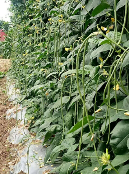 5.水肥管理。开花结果前,一般不追肥。第一次肥在第一花序豆荚坐稳时进行,结合浇水每亩施氮、磷、钾复合肥10~15公斤。结荚后,经常保持土壤湿润,通常每隔10天再次浇水追肥;豆荚盛收期,每次每亩施尿素10公斤、过磷酸钙20~25公斤、硫酸钾5公斤或草木灰40公斤。