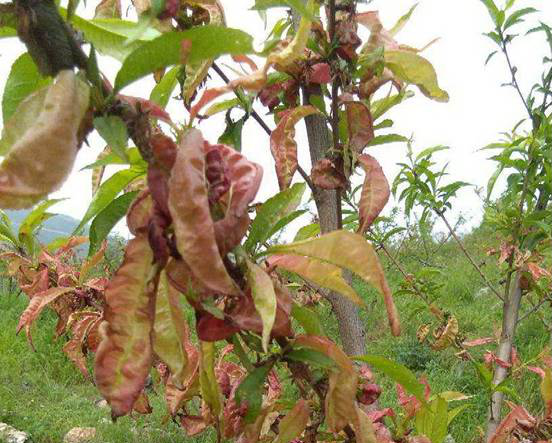 桃缩叶病主要为害桃树幼嫩部分,以侵害叶片为主,严重时也可为害花、嫩梢和幼果。春季嫩梢刚从芽鳞抽出时幼叶就呈现卷曲状,颜色发红。随叶片逐渐开展,卷曲皱缩程度也随之加剧,叶片增厚变脆,并呈红褐色,严重时全株叶片变形,枝梢枯死。春末夏初在叶表面生出一层灰白色粉霜状物,即病菌的子囊层。最后病叶变褐,焦枯脱落后,腋芽常萌发抽出新梢,新叶不再受害。枝梢受害后呈灰绿色或黄色,较正常的枝条节间短,而且略为粗肿,其上叶片丛生,严重时整枝枯死。