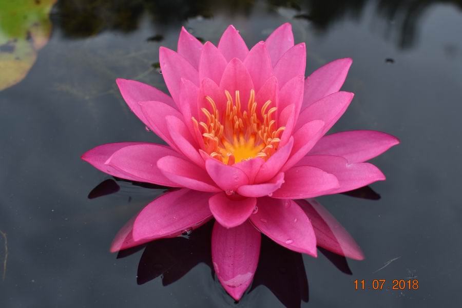 上午开放,午后闭合,花挺水开放,马利列克型根茎,大型品种,着花较繁。花内轮花瓣深黄色,外轮花瓣淡黄色,狭长微皱,顶端向内弯曲。花星形,直径15~20cm,具浓郁的甜香,花瓣数27~29。叶表绿色,新叶绿色带紫色小斑点;叶背淡紫色、绿色,背面红色,具紫色斑点。叶近圆形。花梗和叶柄上具浓重的暗紫色柔毛。该品种长势强盛,萌发力相当强,适合中和大型池塘栽植。
