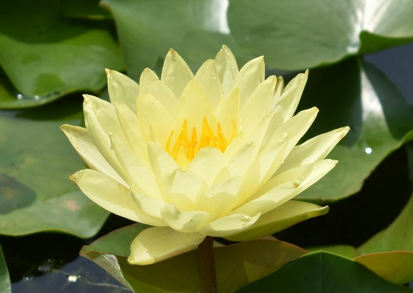 上午开放、午后闭合。中型品种,香睡莲型块茎。花亮黄色,花外瓣中间有粉紫红色条纹或斑点,随开放时间条纹越来越深,挺水开放,花态杯状,花径10-12cm。花瓣18-22枚,瓣长卵圆形。叶片椭圆形,上表面绿色,幼叶有细密紫色斑点,下表面紫红色,有深紫褐色斑点。花梗和叶柄密被柔毛。株叶展幅1.2-1.5m。