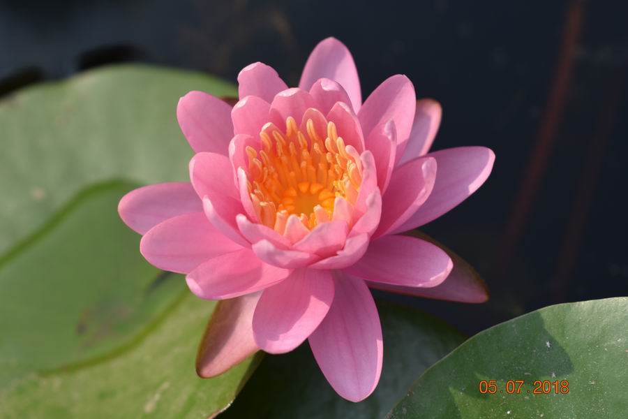 大型品种,马利列克型块茎。开花多,花期长,花态杯状,花径10-12cm。花色橙黄色,随开花时间,花色变深。花朵挺立出水面开放,花瓣18-22枚。叶片椭圆形,上表面草绿色,下表面黄褐色。花梗和叶柄光滑无毛,表皮黄褐色。株叶展幅1.2-1.4m。