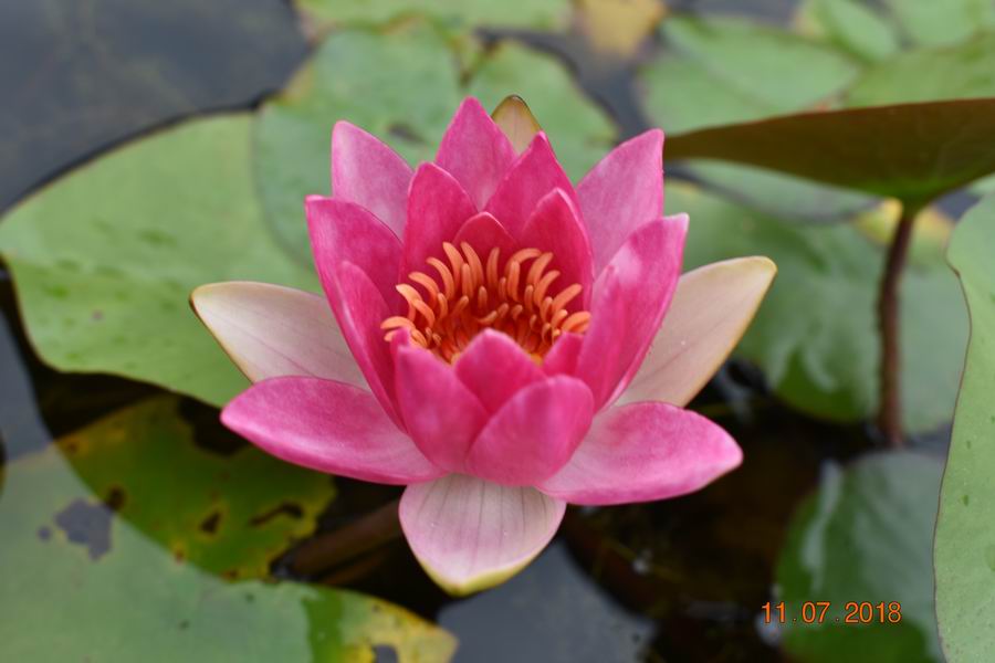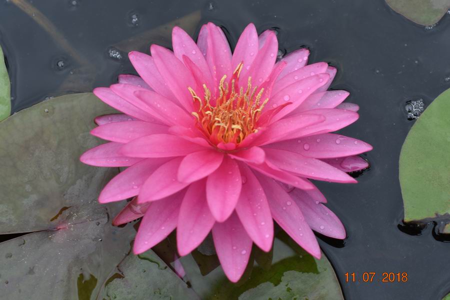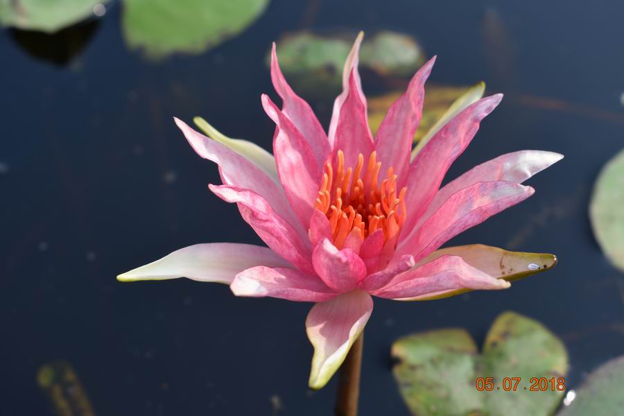 晨开午合,花浮水开放,香睡莲型根茎,着花较繁。花瓣深粉红色,具稍暗的粉红色纵向脉纹。花牡丹型,直径13~15cm,芳香宜人,花瓣数40~50。花梗绿色,具厚绒毛。叶圆形,裂片通常重叠于叶基;叶表绿色,具从叶中心呈辐射状的奇特脉纹图案,脉纹淡绿色,新叶紫红色,脉纹浅紫色;叶背红色。叶柄绿色,具厚绒毛。
