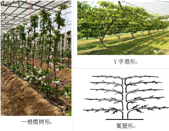 适用于矮化砧樱桃树,树体结构级次少,主干拉平,主枝直立生长,主枝6-12个,间距为15-20cm,呈篱壁式着生在拉平的中干上,直立生长,成形后树高2.8-3m,整个树形呈“一面墙”式结构。用吉塞拉5号做砧木的树,适宜株行距为1.5-1.8m×3-3.5m,用吉塞拉6号做砧木的树,株行距为1.8-2.4m×3-3.5m。该树形具备单位面积产量高、通风透光性好、果实品质佳、省力化、机械化管理修剪、喷药、采摘效率高等优点。UFO栽植一般要使用吊枝和搭架来抗树体倒伏。 大棚密植树型。株行距0.5m×1-3m;树高2.0m左右,主干高60-80cm,中心干上着生20个左右主枝,采用主枝上的一年生果枝基部的花芽结果,结果部位在中心干附近,叶果比高,果实更大。每年将中心干上的生果枝剪短,技术要求简单,苗木栽植第2年即可结果。该树形要通过刻芽,环剥,甚至生长激素的调节来保证主枝的更新,减少随着树龄增长,主干上产生的“光腿”现象。前期3-4年,可以选择极限密植状态,用最快的时间收回成本。而当树体长势粗壮,空间不足时,再逐步隔行移栽至其它大棚或者露地,最后保持在每亩350棵左右密度最佳。 主干呈Y字形,每条干上着生5层,共20个主枝,用铁丝绑缚至水平。主枝角度开张,树冠通风透光好。 10.篱壁形 主干高40-50cm,树高2-2.5m,在中心干上着生4-5层水平生长的8-10个主枝,层间距为30-40cm,每层两个主枝,顺行对生,在主枝上直接配备中、小型结果枝组。篱壁形树需要由立柱和铁丝支撑,将枝条绑在铁丝上,形成篱壁形。主枝角度开张,树冠通风透光好。由于顶端优势受到抑制,结果枝形成早,发育好,结果部位集中,采摘方便。 生产上樱桃采用任何树形都有其优缺点,生产者一定要根据立地条件、品种、砧木、劳动力状况和技术水平,选择适宜的树形和修剪方式。
