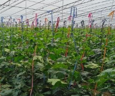 4.1距地面2—2.2米高拉钢丝;固定钢丝吊绳;绳长与钢丝高度一致。丝瓜吊绳15股尼龙绳;苗高40cm开始吊绳,吊在老叶底下。