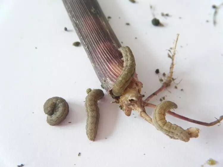 为害状:幼虫主要从玉米幼苗茎基部钻蛀到茎心后向上取食,形成圆形或椭圆形孔洞,钻蛀较深切断生长点时,心叶失水萎蔫,形成枯心苗;严重时直接蛀断,整株死亡;或取食玉米气生根系,造成玉米苗倾斜或侧倒。