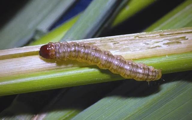 为害状:在玉米心叶期,初孵幼虫大多爬入心叶内,群聚取食心叶叶肉,留下白色薄膜状表皮,呈花叶状;二、三龄幼虫在心叶内潜藏为害,心叶展开后,出现整齐的排孔;四龄后陆续蛀入茎杆中继续为害。蛀孔口常堆有大量粪屑,茎杆遇风易从蛀孔处折断。由于茎杆组织遭受破坏,影响养分输送,玉米易于早衰,严重时雌穗发育不良,籽粒不饱满。初孵幼虫可吐丝下垂,随风漂移扩散到邻近植株上。